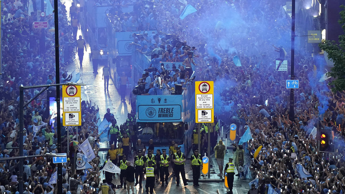Ngay cả sấm sét cũng không thể ngăn cản màn ăn mừng tưng bừng cứu thua cú ăn ba của Manchester City sau khi Ilkay Gundogan và các đồng đội giành chiến thắng trong bóng đá châu Âu. Khi chiến thắng của nhà vô địch Champions League mới đăng quang với ba danh hiệu của mùa giải bắt đầu bị trì hoãn một chút sau cơn bão mùa hè dữ dội trong một chiếc xe buýt tiệc tùng mở tại Tháp Beetham cao 169 m, các đường phố ở trung tâm đô thị 600.000 cư dân chìm vào một biển màu xanh da trời của hàng chục ngàn người hâm mộ say xỉn và có lẽ là lễ kỷ niệm lớn nhất trong thành phố của tầng lớp lao động.